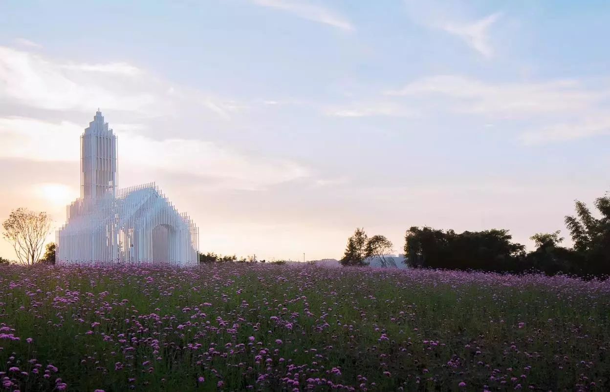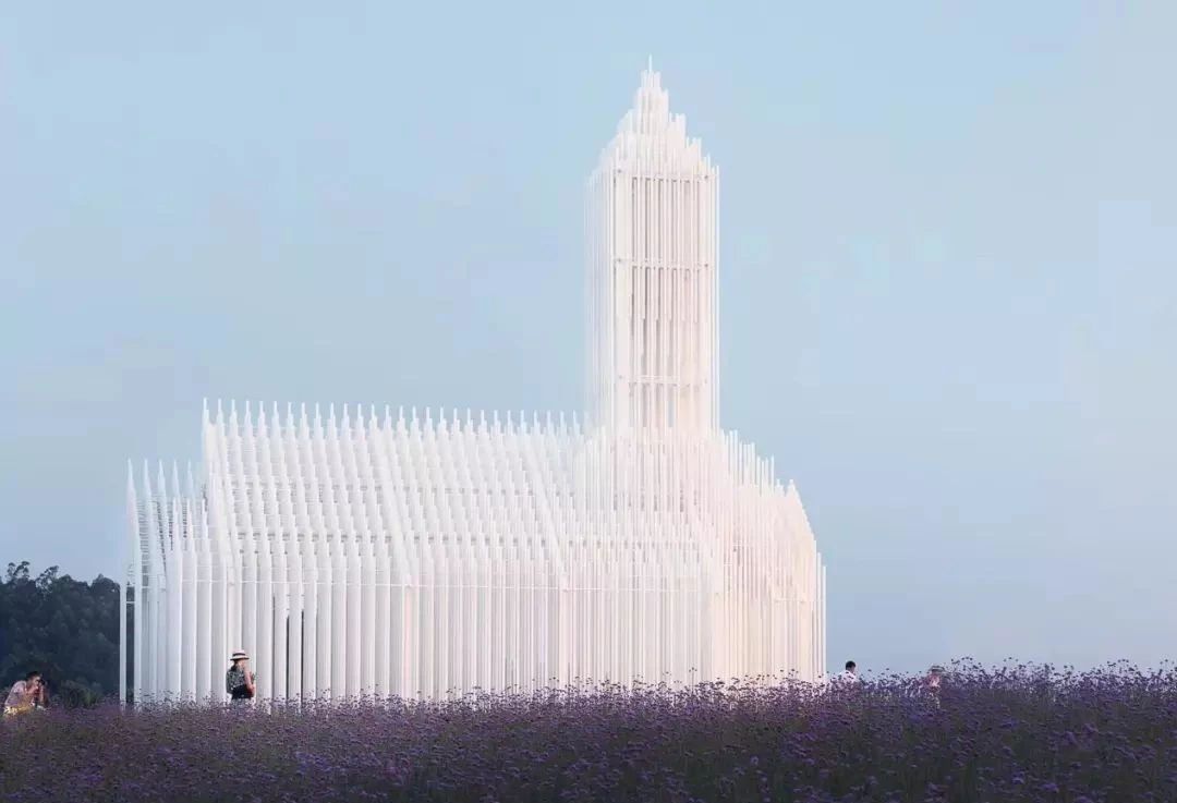 “无影教堂”,又名“消失的教堂”,是眉山中法农业科技园标志性景观构筑物之一。教堂完全采用白色铝方通材料堆叠而成,内外空间通透,白色与光影交织,与环境融为一体,故被称作“无影教堂”。凭借超高的颜值和魔幻的魅力,这座在绿色山丘和紫薰花海掩映下的教堂,成为了刷爆微博与朋友圈、火遍抖音和小红书的网红圣地。亮相短短半年时间,已有数十万人前来“打卡”,选择在这里拍摄婚纱照的新人更是络绎不绝。
